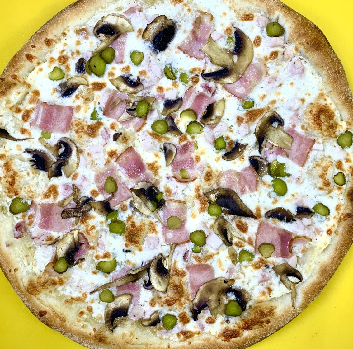 Соус риджано, моцарелла, бекон, курица, шампиньоны, маринованные огурцы