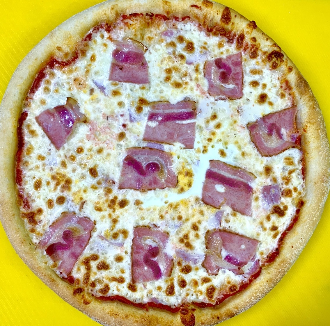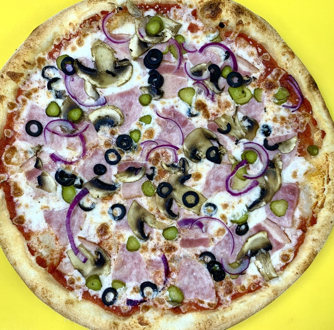 Фирменный томатный соус, ветчина, бекон, шампиньоны, мариновванные огурцы, лук